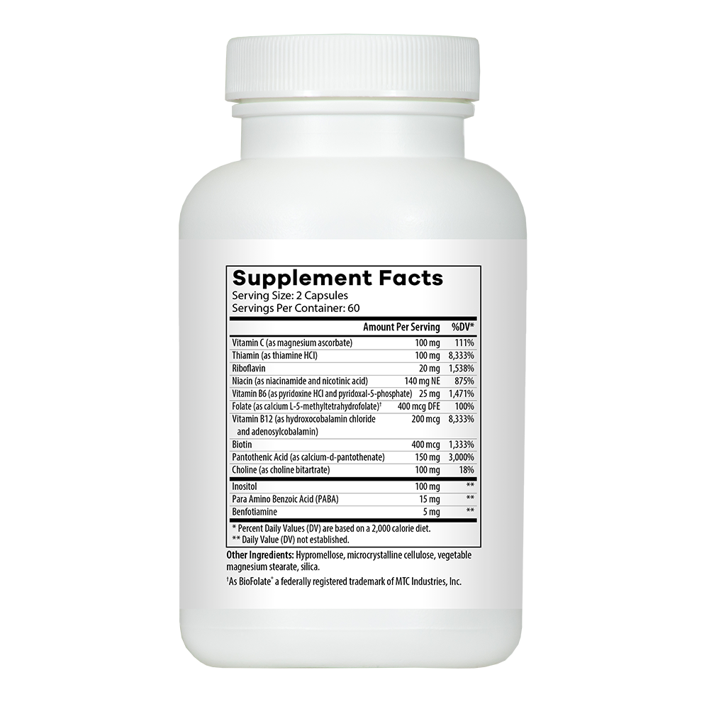 B-Complex is a comprehensive supplement formulated to support the body’s stress response, as well as cognitive performance, central nervous system function, and cardiovascular health. The full range of B vitamins are included to ensure maximum coverage for all ages and needs. The updated formula now contains vitamin B12 as hydroxocobalamin chloride and adenosylcobalamin. In addition, Vitamin C is included to complement the benefits of this comprehensive blend.