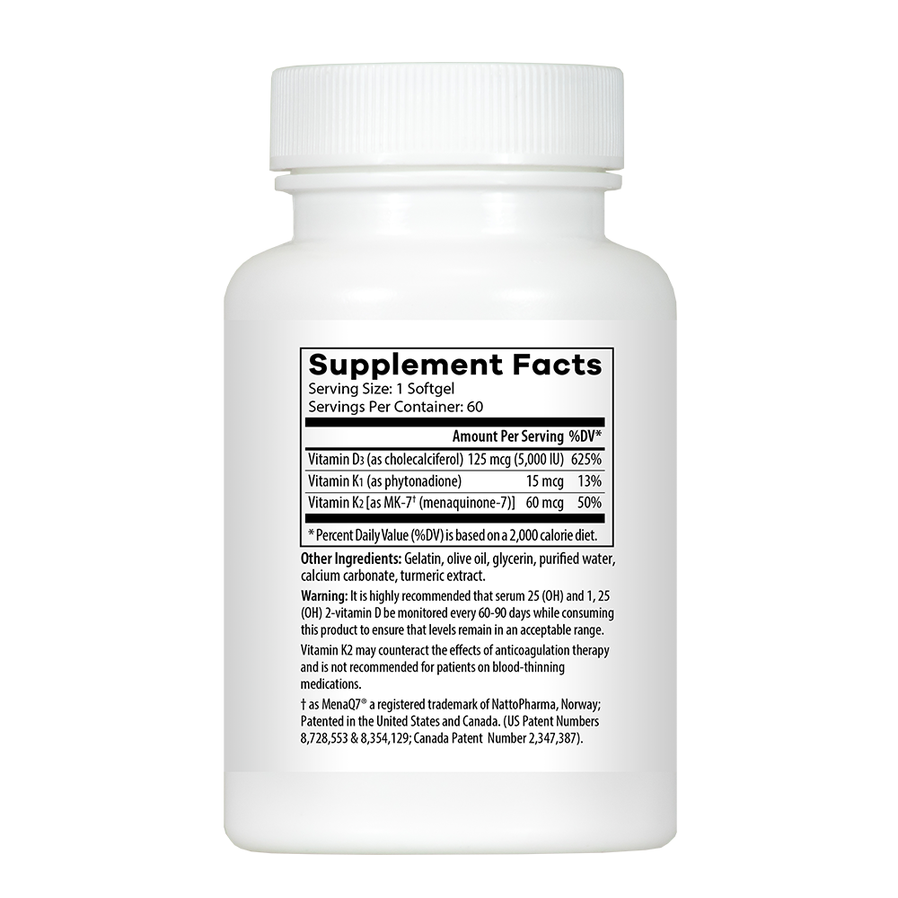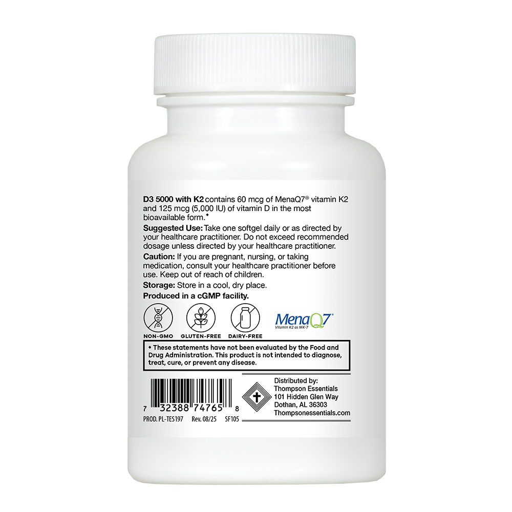 D3 5000 with K2 is a highly bioavailable form of Vitamin D3—as cholecalciferol—and Vitamin K2—as patented MenaQ7®. Vitamin D3 and Vitamin K2 are essential micronutrients with critical roles throughout the body, such as supporting stress levels, bone health, skin health, heart health, and immune function.◆