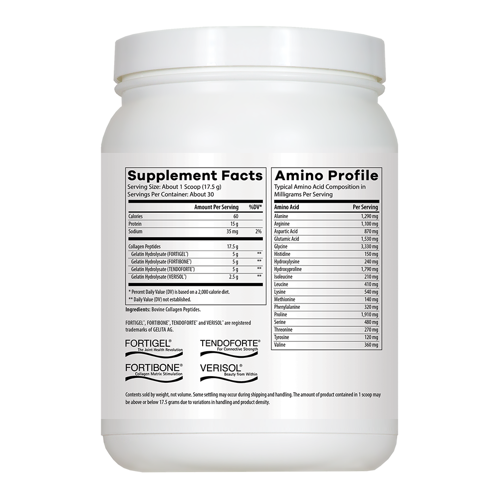 Multi Collagen contains Fortigel®, Fortibone®, Tendoforte®, and Verisol® collagen peptides to promote vibrant skin and nails while supporting healthy joints, bones, ligaments, and tendons. Each peptide blend delivers targeted benefits: Fortigel® supports joint health, Fortibone® promotes bone strength, Tendoforte® supports ligaments and tendons, and Verisol® enhances skin and nail health.