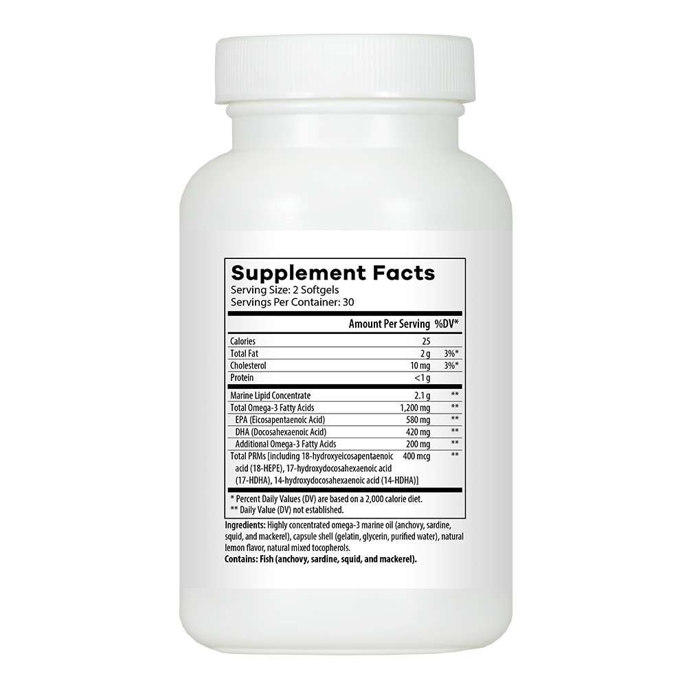 PRM Pro is a proprietary formula providing pro-resolving lipid mediators (PRMs), which help encourage “specialized pro-resolving mediator” (SPM) production in the body. SPMs are unique molecules that support novel pro-resolving mechanisms and play extensive roles in host defense, tissue remodeling, and organ support.